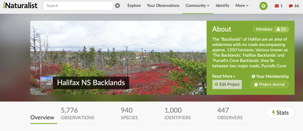 I set up an iNaturalist “Project” – “Halifax NS Backlands” – on April 20, 2020 which collates all iNaturalist observations within the Backlands, that area defined by a map (see image at right).